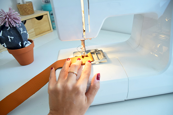 Con la bolsa del puf cosida en su totalidad sólo nos queda fijar el cojín a el palet. Para ello usaremos unas tiras de piel que ademas de unir las dos piezas le darán un toque muy bonito a el conjunto.