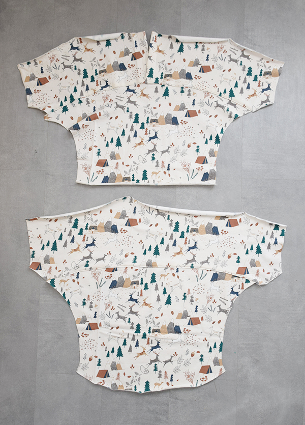 Con las dos caras de la sudadera montadas, enfrentamos los dibujos entre si y cosemos por la parte trasera para unir estas dos piezas dejando sin coser la parte de los puños y la zona del cuello y cintura. Rematamos los dobladillos del final de la sudadera.