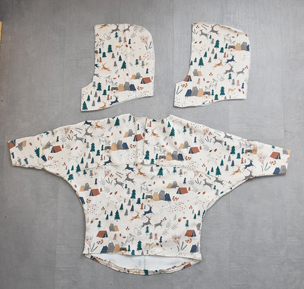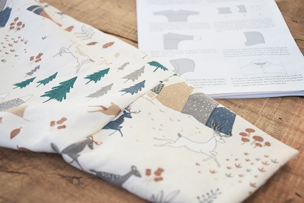 Sólo nos falta coser los puños y la capucha a la pieza. Tanto los puños y la capucha son con tela doble por lo que habrá que coserlas primero entre si para que sus caras visibles sean con dibujo.