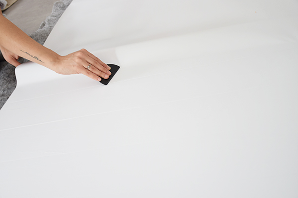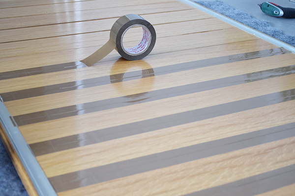 El armario no era una tabla lisa continua, si no que estaba formado por tablones. Después de haber limpiado bien toda la superficie, cubrimos las ranuras con cinta para intentar que al poner el vinilo se notaran lo menos posible. Al igual que en el dormitorio del peque y conociendo ya la marca, volvimos a confiar en Lokoloko, su calidad nos encantó y cuando algo funciona bien mejor no cambiar.