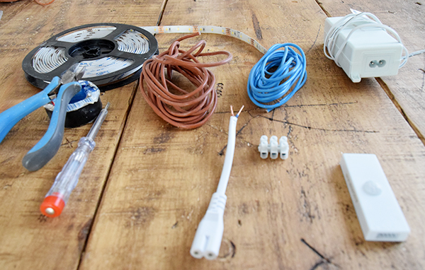 Compramos un kit de led en Leroy Merlin que ya viene con todo lo necesario para poder montarlo en casa (sensor incluido). Con el kit, un rollo de cable conductor, de cable neutro, alicates, cinta aislante, unas clemas y un destornillador comprador de corriente, tendremos todo lo necesario para instalar la luz led.