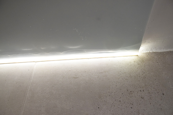 La plancha de pladur la agarraremos al techo con unos tornillos bien apretados para que quede al ras del pladur. La tira led viene con pega, pero nosotros debido a que se encuentra en un lugar húmedo la fijamos también con silicona.