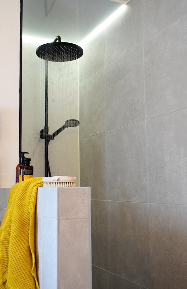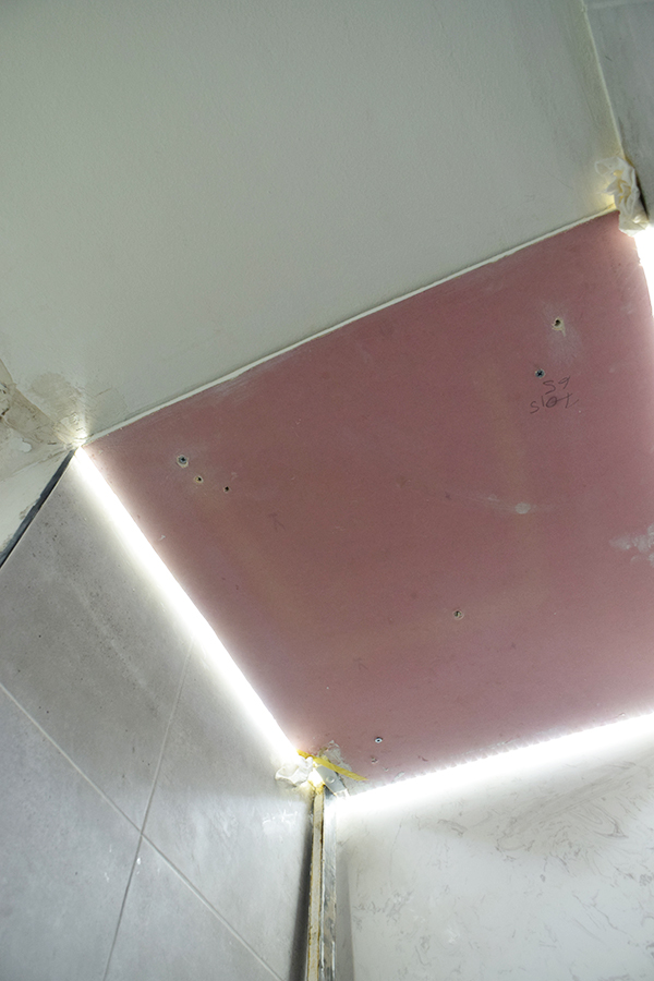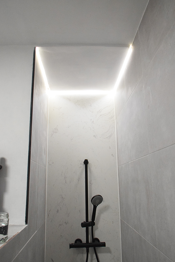 Por aquí seguimos enseñando poquito a poquito la reforma del baño y es que al ser un cambio tan radical da para mucho…. como ya os adelanté en mi post anterior, Dani tuvo la genial idea de instalar una luz led en el techo de la ducha.