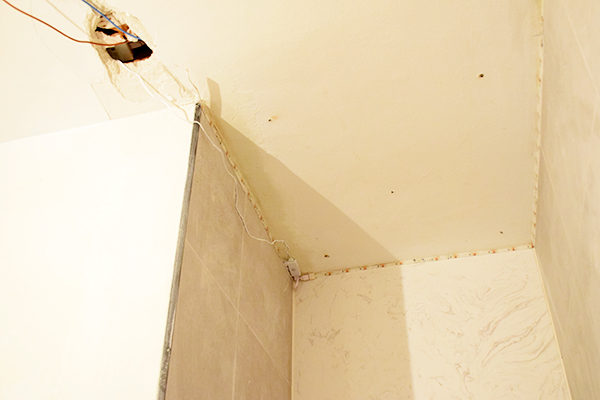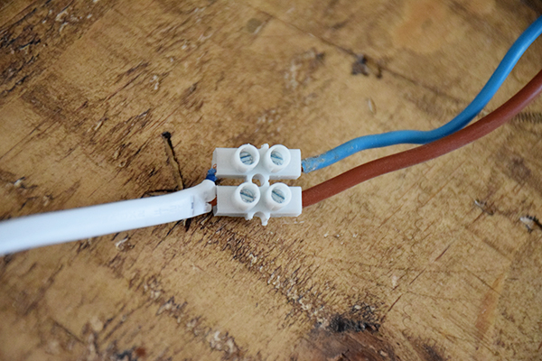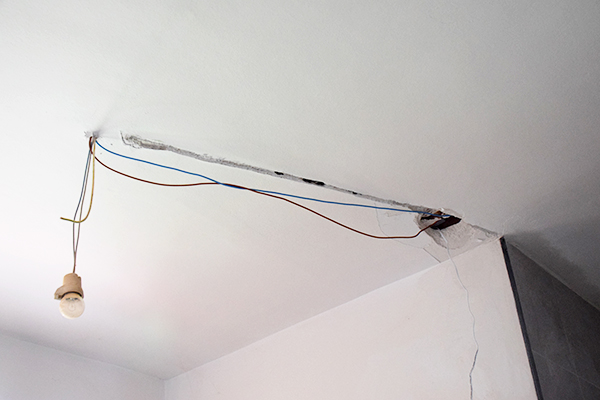 Primero hacemos la unión del cable del led a los cables de la luz donde queremos sacar la toma. En nuestro caso la luz mas cercana es la del techo donde hemos hecho una roza hasta el plato de ducha para poder llevar la corriente a la tira led.