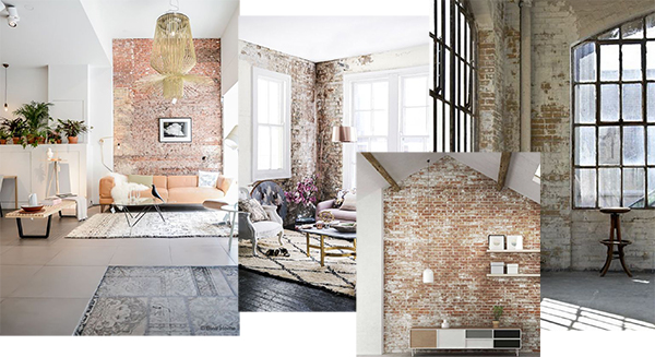 Estuvimos mirando por internet como darle un aspecto envejecido pero actual a esa pared (como veis en el collage), hay muchas técnicas como cubrir superficialmente con cemento blanco en algunas zonas para crear ese aspecto descascarillado, pero la pega de esta técnica es que también cubre las ranuras que hay entre los ladrillos y nosotros no queríamos eso, además buscábamos un resultado mas blanco.