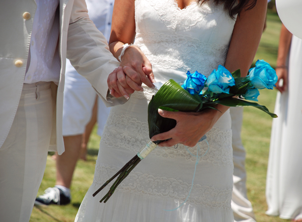 Toda la boda estuvo inspirada en el color blanco y turquesa, tal y como iba la novia con su ramo de rosas turquesas.