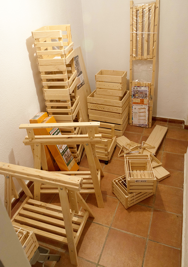 Tampoco podía falta una estantería alta de almacenaje, en este caso es la Evolution con 5 baldas regulables y un carro verdulero. Por supuesto las cajitas y cajoneras de madera vienen fenomenal para mantener todo en orden.