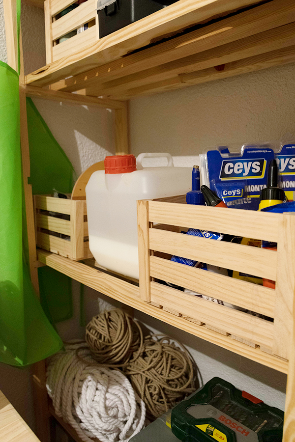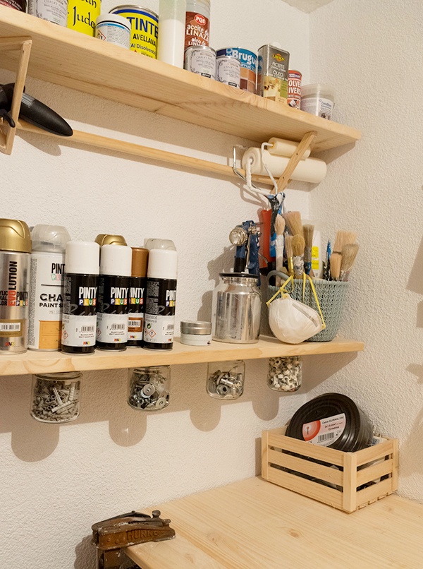 Como veis en la estantería inferior hemos atornillado las tapas de unos botes de cristal para meter tuercas y puntas. De esta forma las tenemos siempre visibles.