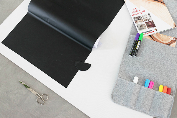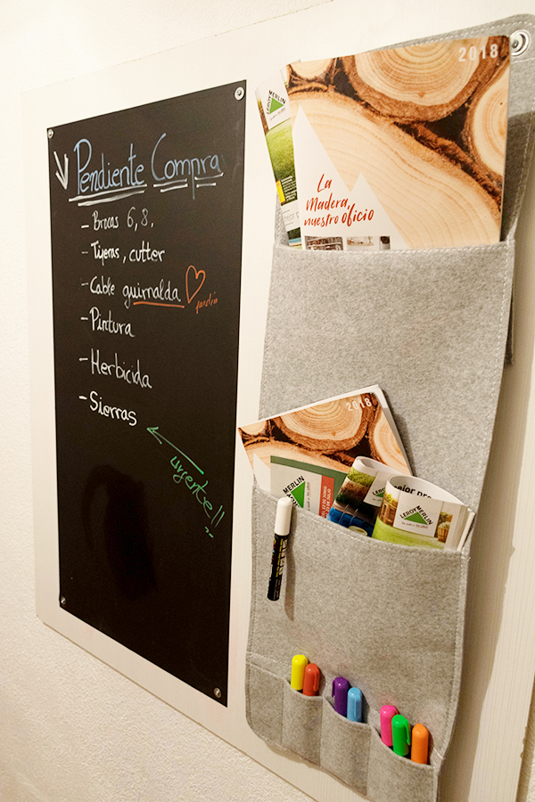En la pared trasera hemos puesto un tablón para apuntar lo que vamos necesitando junto con un revistero para ir guardando los catálogos y revistas de nuestras marcas de brico favoritas. Hemos usado un trozo de tablón blanco porque ese cuarto tiene las paredes con gotelé y escribir en el vinilo de pizarra iba a ser imposible….