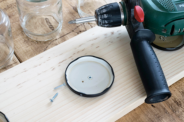 Tan sólo tenemos que hacer dos agujeros a las tapas y atornillar con un taladro a la madera. Damos la vuelta al tablón y enroscamos todos nuestros botes, no os encanta la idea? yo la vi por pinterest y me pareció genial!