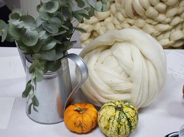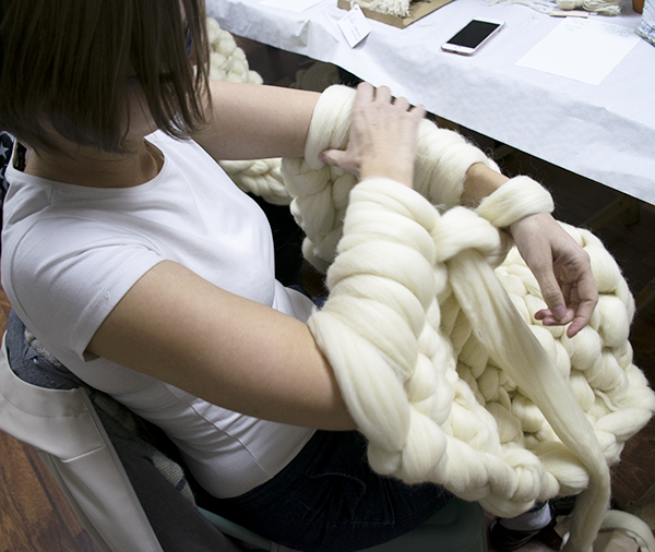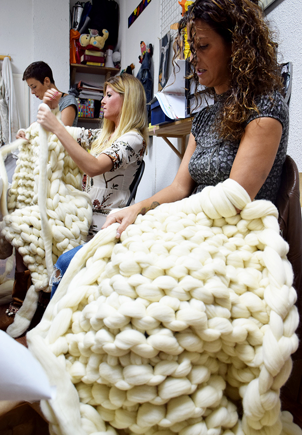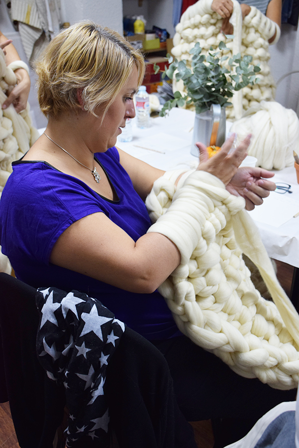 Una vez hechas las presentaciones y habiendo dado unas pequeñas explicaciones del tipo de lana que tenían delante, era momento de meterle mano y nunca mejor dicho nuestro super ovillo de 2 kilos! empezamos a tejer con los brazos nuestra preciosa super manta xxl de lana merino.