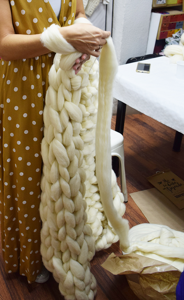 Hoy os quiero hablar del taller de manta xxl que tuve la suerte de impartir el sábado pasado en Casa Cuadro. Sólo os puedo decir que todavía me perdura el buen sabor de boca, no se si es la magia de ser el primero, de las súper alumnas que tuve, de vivir con pasión lo que te gusta o que se alinearon los astros para que saliera todo redondo y nos echáramos muchas risas entre kilos y kilos de la lana mas esponjosa y suave del mundo.