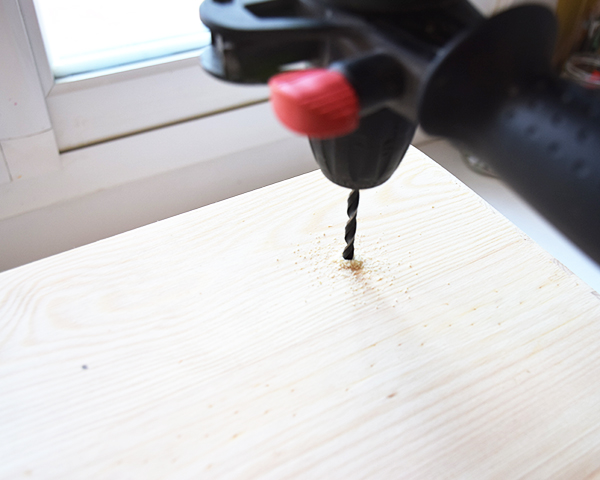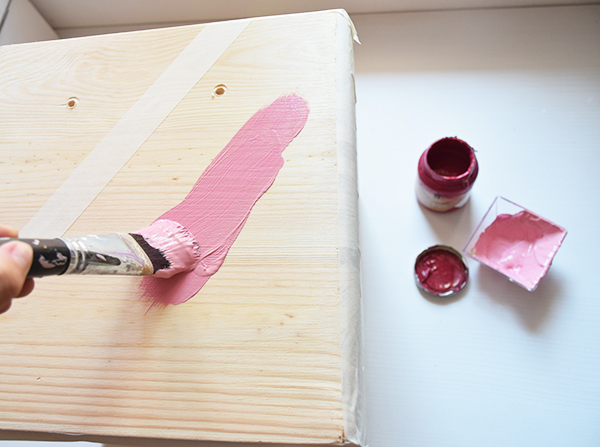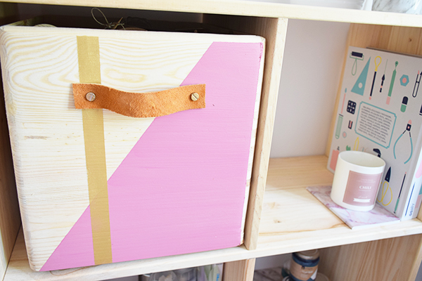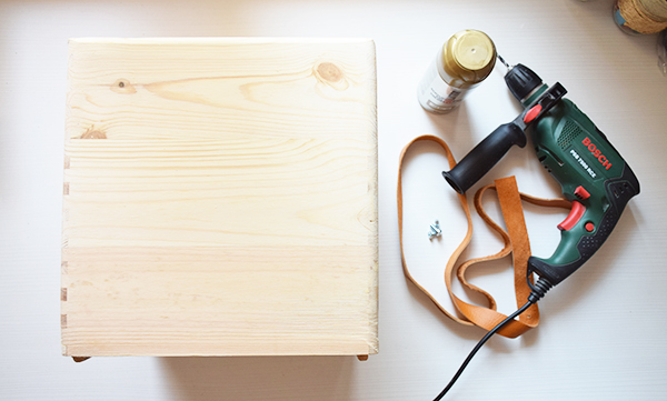 Para la caja he usado taladro y piel para hacer un tirador, he pintado las tuercas con spray dorado y he hecho un pequeño dibujo geométrico con rosa y dorado.