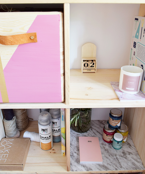 En la estantería doble he decorado con un poco mas de vinilo de mármol y una franja de rosa. (he aprovechado que este espacio es mio para ponerlo un poco pink)